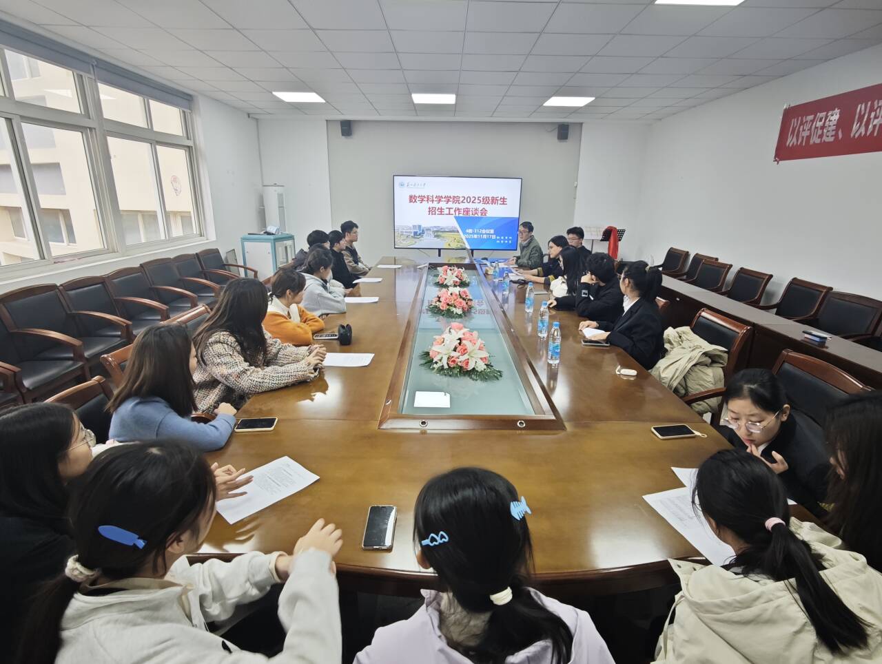 为提升招生宣传实效,赋能“寒假回访母校”活动,11月17日,数学科学学院在天平校区4教-312会议室举办了2025级南通地区新生招生工作座谈会。学院党委副书记胡世怡、辅导员程智龙、高年级学生代表及20余名南通与其他地区新生代表共同参与,围绕“倾听新生心声,汇聚智慧力量,共促招生工作提质增效”展开交流。