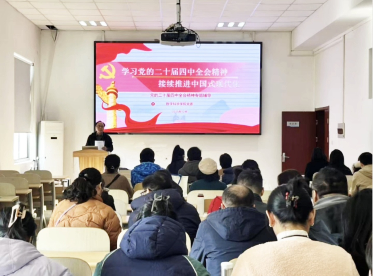 为深入学习贯彻党的二十届四中全会精神,12月3日下午,数学科学学院举行党的二十届四中全会精神宣讲报告会,学院党委书记王开永以《学习党的二十届四中全会精神 接续推进中国式现代化》为题作宣讲,学院全体教职工参会学习。