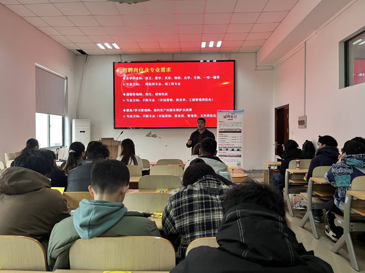 为精准搭建用人单位与毕业生双向对接平台,助力毕业生实现高质量充分就业。12月23日下午,数学科学学院在教2-303召开腾大教育集团招聘宣讲会,学院党委副书记胡世怡、毕业班辅导员以及数学与应用数学(师范)、物理学、化学(师范)等专业毕业生参会。宣讲会由学院党委副书记胡世怡主持。