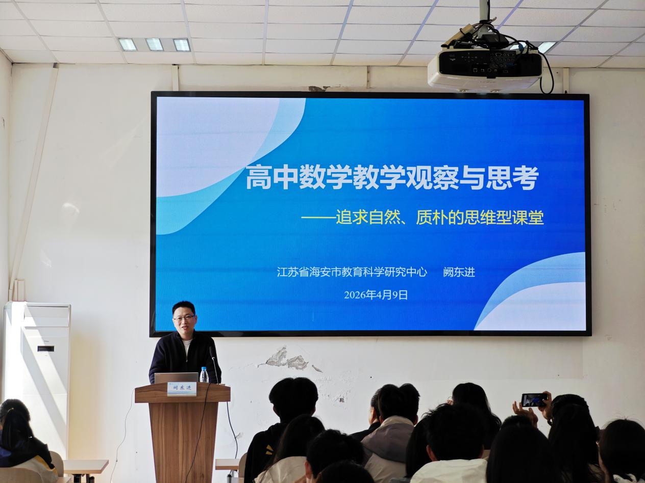 4月9日下午,数学科学学院邀请1994届优秀校友、海安市教育科学研究中心教研员阙东进,为学院师生作“高中数学教学观察与思考”专题讲座。学院党委副书记胡世怡主持,原后勤党总支书记许金林、辅导员及部分数学师范专业学生代表参加。
