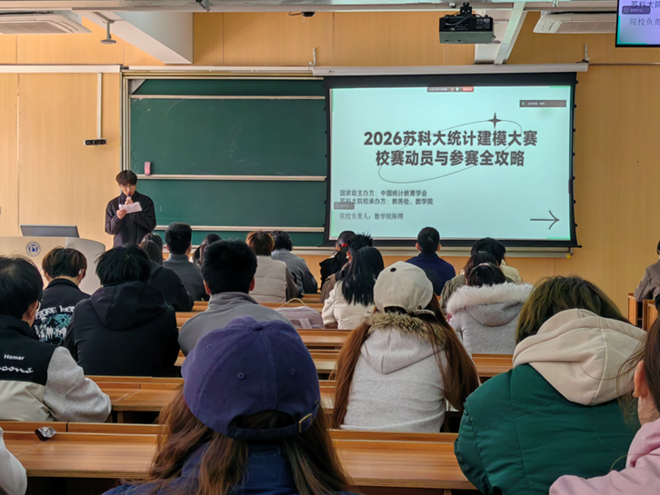 3月25日下午,数学科学学院统计系在石湖校区举办“2026年统计建模大赛宣讲会暨师生交流会”,近两百名师生参加会议,会议由统计系主任董迎辉主持。